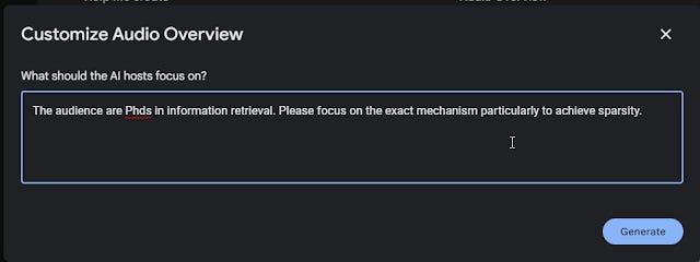 For example, the SPLADE paper example now generates a more more technical audio overview discussion with the custom instructions above.