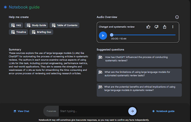 How about something closer to librarian's? Here's audio overview of a series of papers on the use of LLM to construct boolean queries for systematic. and predictably it spent a big part of the podcast explaining what a systematic review and why it's important.