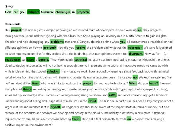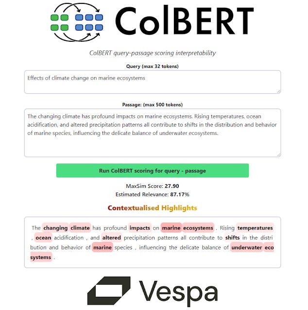 Vespa has even implemented a interface that you can use to help with ColBERT scoring interpretability