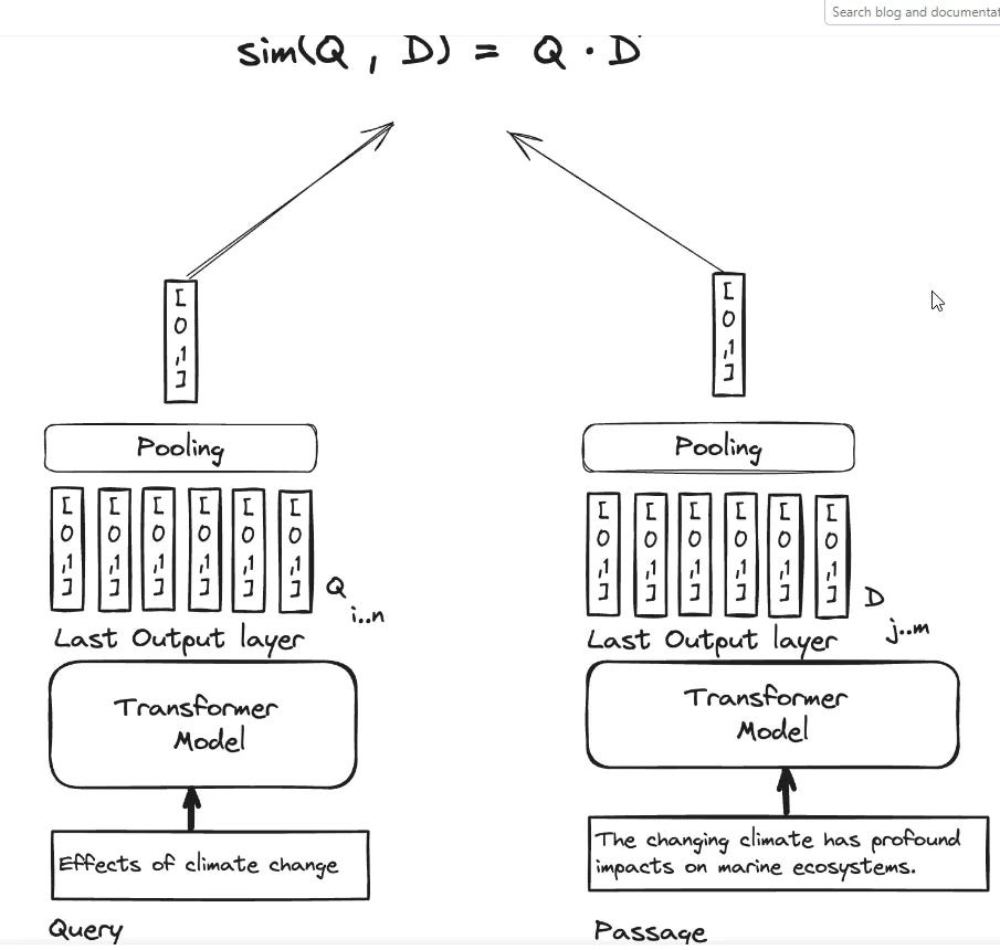 This overall embedding of the document and query is then used by comparing each other with a similarity metric (typically dot product, cosine similarity etc) and the documents are ranked by these scores.