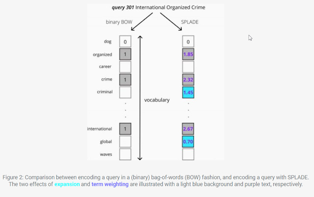 In the example above, you can see once trained, SPLADE, not only sets weights based on the query term "International", "organized", "crime" but also automatically expand to include "global" and "criminal".