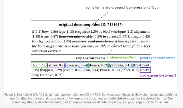 The same happens for the document representation where SPLADE will not just weight the words in the document but include or exclude other words.
