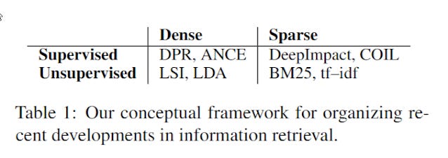 I followed up with another blog post, that went deeper into the differences between Sparse retrieval methods that generally involve the use of Sparse embedding/representations (almost always bag of words approach) vs dense retrieval methods that generally use dense embedding/representations.