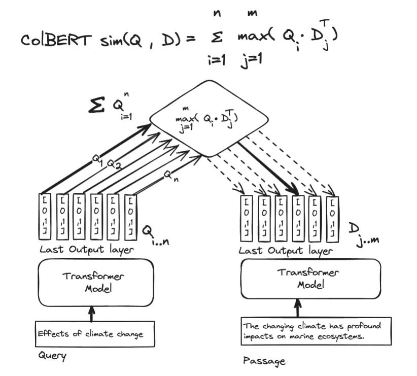 The idea behind ColBERT is instead of pooling all the token embedding into one overall embedding why not store and compare the embeddings of each token by token and use them for comparisons...