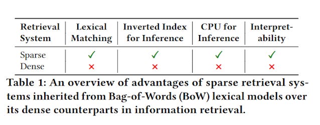On the other dense retrieval methods, can be costly to implement compared to inverted indexes, and lack interpretability and the desirable properties of bag of word models to do exact-match of terms.