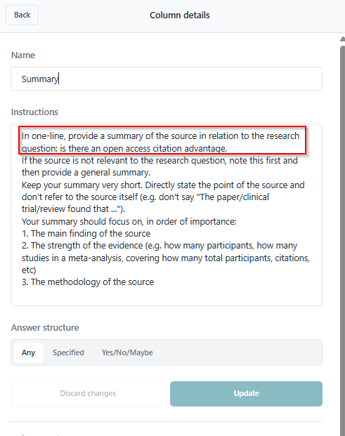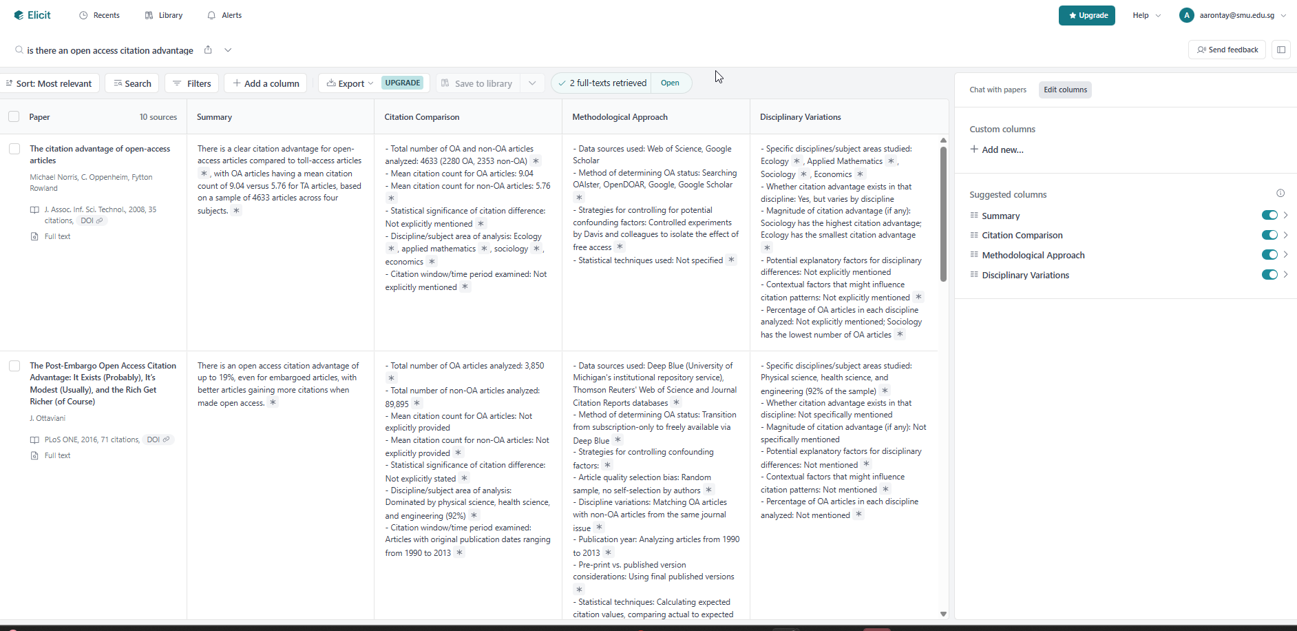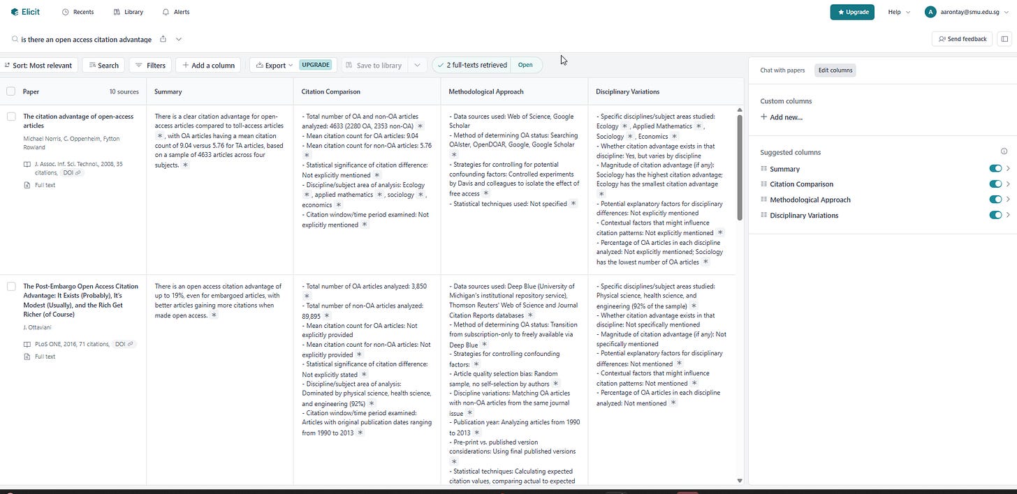 The auto-generated summary column serves a useful secondary purpose—it acts as a relevance indicator. Because the summary instruction is query-dependent (e.g., “In one line, provide a summary of the source in relation to the research question: is there an open access citation advantage”), irrelevant retrievals become obvious when the summary cannot address the query.