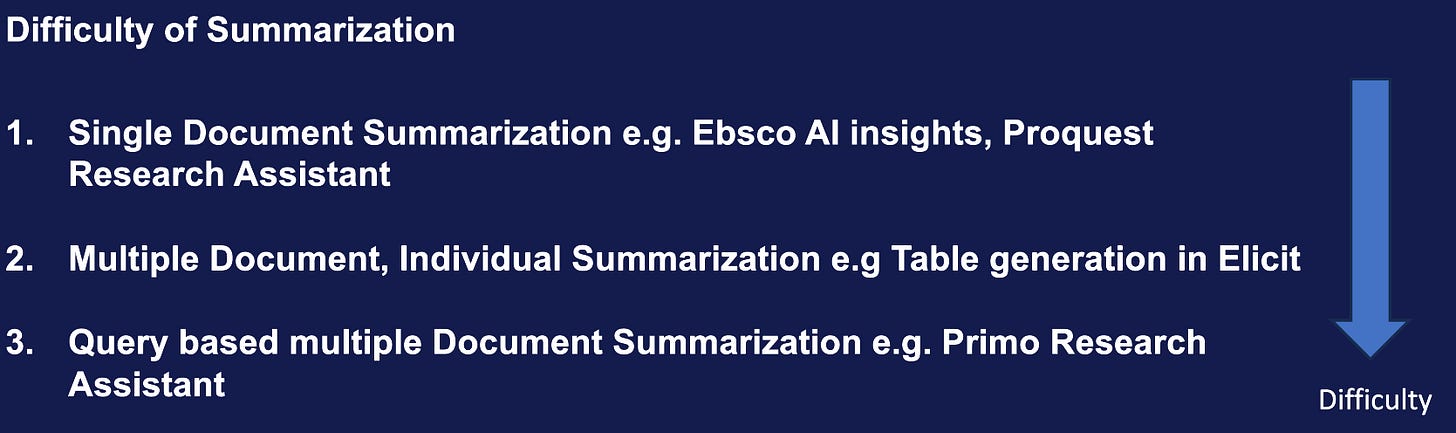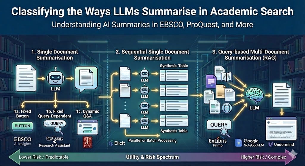 Not all “summaries” are created equal. Treating AI summarisation as a monolithic capability is a mistake. There is a world of difference between a pre-canned summary of a single article (Fixed Button) and a dynamic synthesis of conflicting claims across twenty papers (Query-based Multi-Document Summarisation).