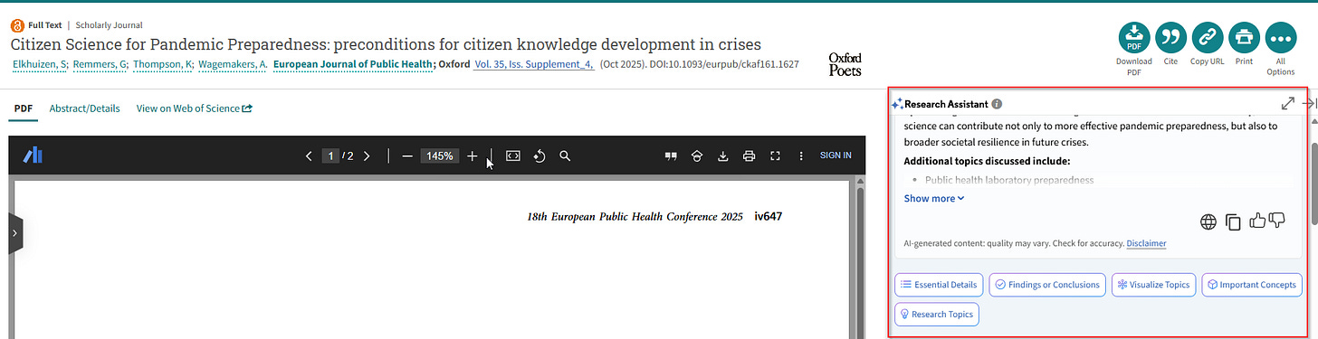 ProQuest Research Assistant demonstrates this well. When you click on an article, a sidebar automatically generates “Key Takeaways” along with options for Essential Details, Findings or Conclusions, Important Concepts, and more.