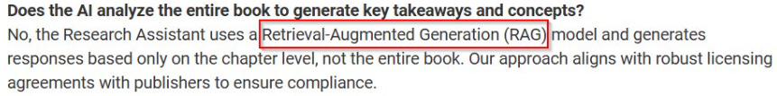On that last point: pre-generation would save compute and ensure consistency, but I suspect most vendors avoid this for IP reasons. That said, the FAQ for Ebook Central Research Assistant notes it will “generate the same response for each chapter, regardless of who the user is or when they submit the prompt.”