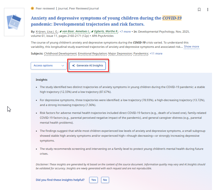 When the AI Insight button is clicked, a prompt is sent to a Large Language Model (LLM) prompting the AI to summarize the full text article into 2-5 relevant insights into the article. We ground the AI response on the full text (with publisher permission) to reduce hallucinations. No AI training is done on the full text article. The user query is not used in AI Insights.