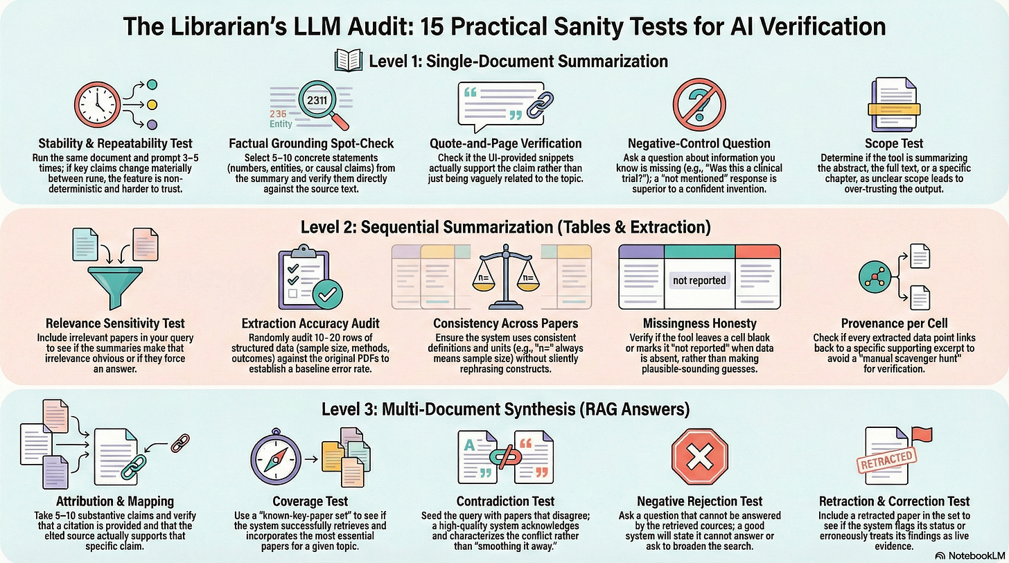 Robust evaluation of LLM summarisation is still an active research area5. But librarians don’t need perfect metrics to run useful, repeatable checks. Here are five practical “sanity tests” for each category—lightweight enough to do routinely, but strong enough to surface the common failure modes.