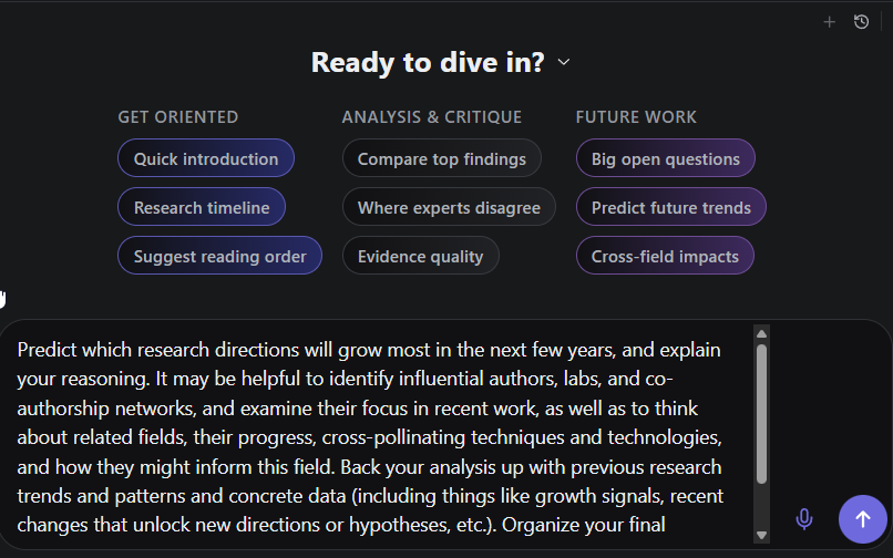 Notably, for questions like “Predict future trends,” the system can search the general web in addition to the papers already found in the academic corpus (Semantic Scholar)—a sensible design choice since trend prediction often requires non-academic sources.