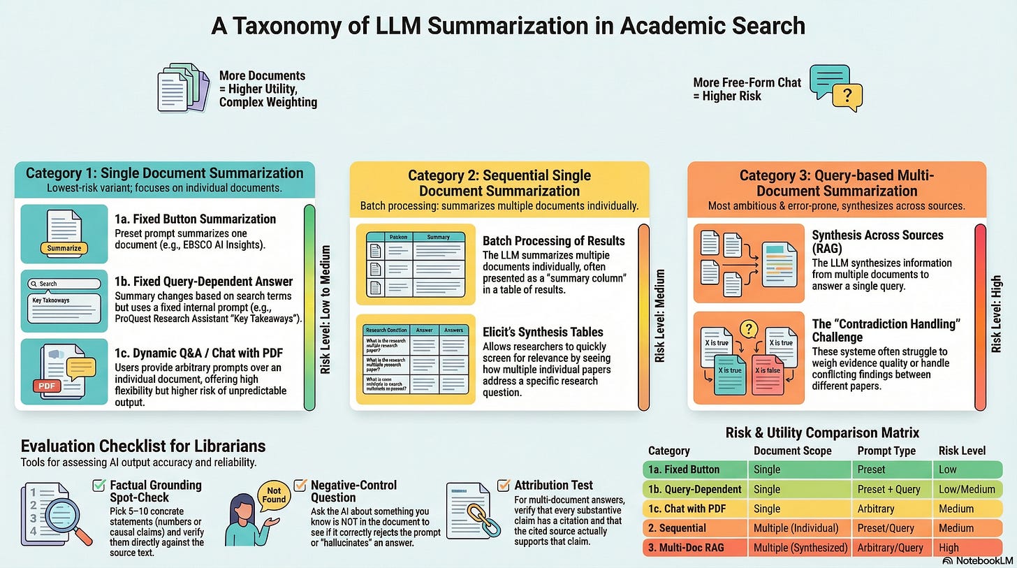 For librarians and researchers, understanding this taxonomy is crucial for information literacy instruction and tool evaluation. A fixed, single-document summary is relatively safe but limited—essentially a glorified abstract. As we move into dynamic, multi-document RAG, utility increases substantially, but so does complexity and error potential.