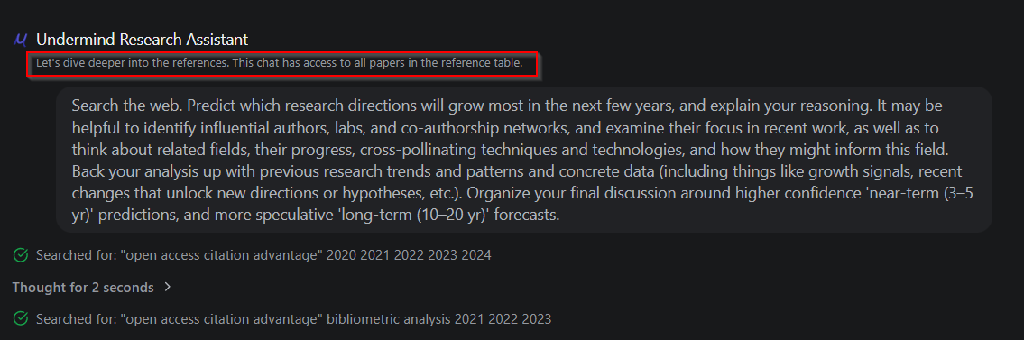 Undermind.ai’s “Ask Expert” feature takes a different approach: after its iterative Deep Research process identifies relevant papers, you can ask follow-up questions.