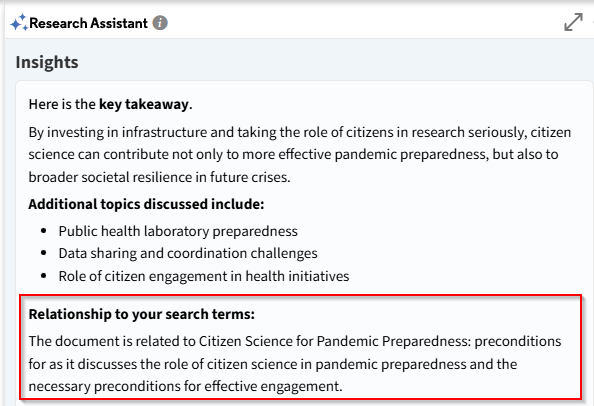 Most of these features match 1a, except for one crucial difference: the “Relationship to your search terms” section in the auto-generated “Key Takeaways”. This means even with deterministic generation, results vary depending on the query used to find the paper.