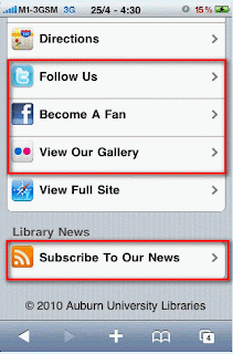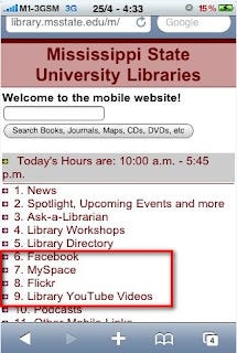 Some of such services linked to in library mobile sites includes Twitter, Blogs, YouTube, Flickr, Facebook, MySpace etc. Some examples below