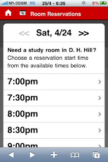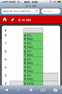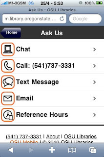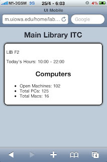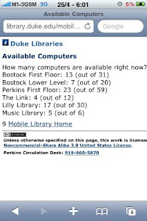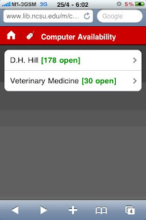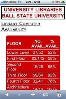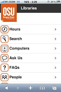 While most of the services above are relatively easy to offer, some libraries have began to offer extra services. In particularly checking of availability of computers in libraries is available in the mobile versions of some libraries. Oregon State University has a "computers" option but at the time of writing, I got an error when accessing the page (library wasn't open at the time?)