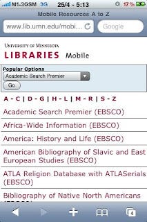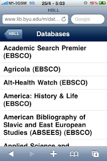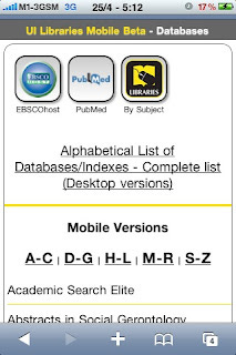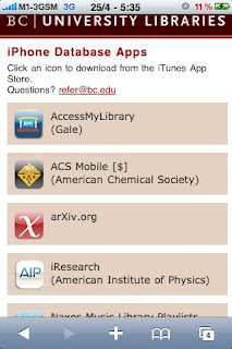 Many libraries also provide links to mobile enabled databases (and some link to all databases either directly or via library catalogue). Currently there isn't that many, though libraries that depend heavily on EBSCOhost have the edge here since the databases they form on this platform are mobile friendly. Medical libraries also have an edge since PubMed is mobile friendly. Others include IEEExplore, Naxos etc. See list here .