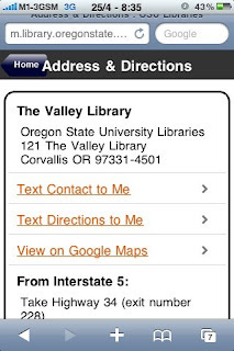 Oregon State University MobileLib allows one to text the directions and/or library contacts.