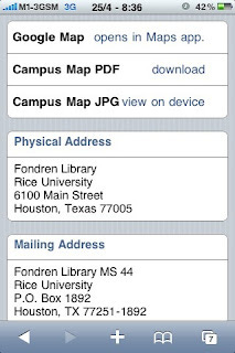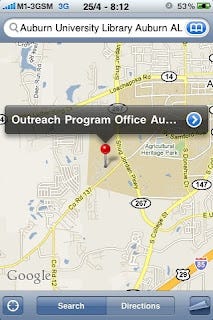 Many libraries such as Auburn University Libraries simply provide a link to Google maps for directions to their library. Clicking on the link in iPhone will open it in the Maps apps (see below).