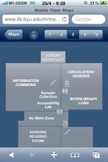 How about a floor plan of the library? I'm somewhat disappointed that libraries that have this, display merely static maps. See for example Brigham Young University, Harold B. Lee Library