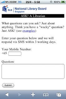 A slightly different tack is taken by the National Library Board, while questions can be submitted via the web form, answers will be sent via SMS.