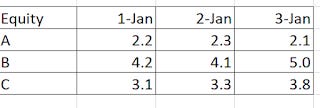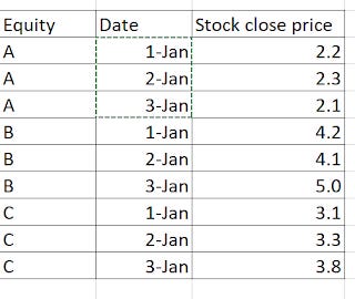 Say I'm want to find the closing stock price over 3 days for 3 Equities A, B, C.