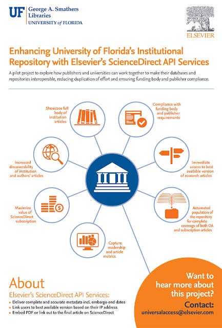 Just a few days earlier they announced a pilot program with University of Florida that allows metadata from Sciencedirect to automatically populate the Institutional repository.