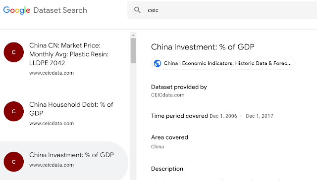 In terms of coverage, it's hard to do a comprehensive comparison, but I do notice that not just open data can appear. For example closed/properitary data from CEIC is findable too! There is no link though. This makes me wonder will it also surface closed datasets that have metadata in Schema.org? I would guess yes?