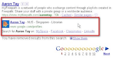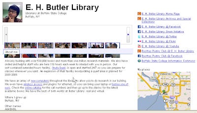 This was until April 2009, where they placed their trump card. Two changes occured, one minor change, one major. The first change was that they allowed users to use a custom profile url, instead of a long string of numbers. For sure http://www.google.com/profiles/aarontay looks better than http://www.google.com/profiles/104559151215707191902. Below shows an example of a Google Profile set up by E.H Butler Library.