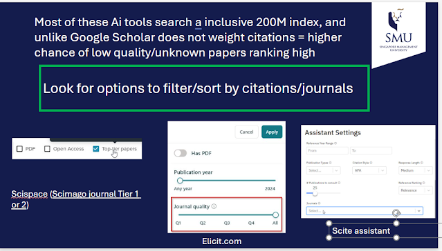 To handle this, both Elicit and SciSpace have post filters that allow you to filter by Journal quality (Scimago Journal Rank - SciSpace covers Q1 & Q2)
