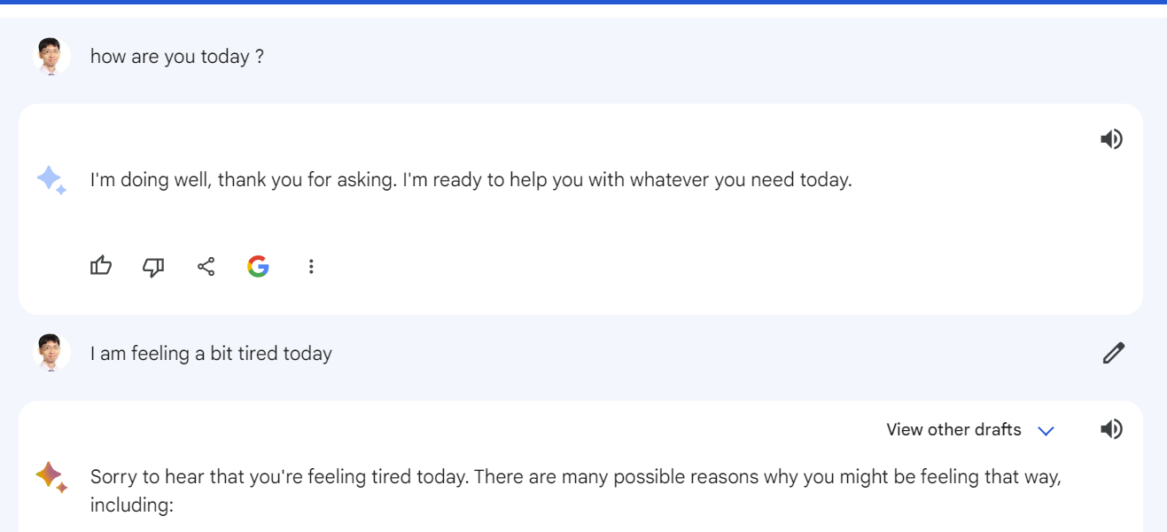 For example, unlike Bard or Bing Chat, you cannot have a casual conversation about life and the weather. See below a conversation with Bard.