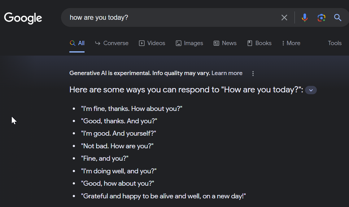 Trying to chat with Google SGE gets an odd literal answer.