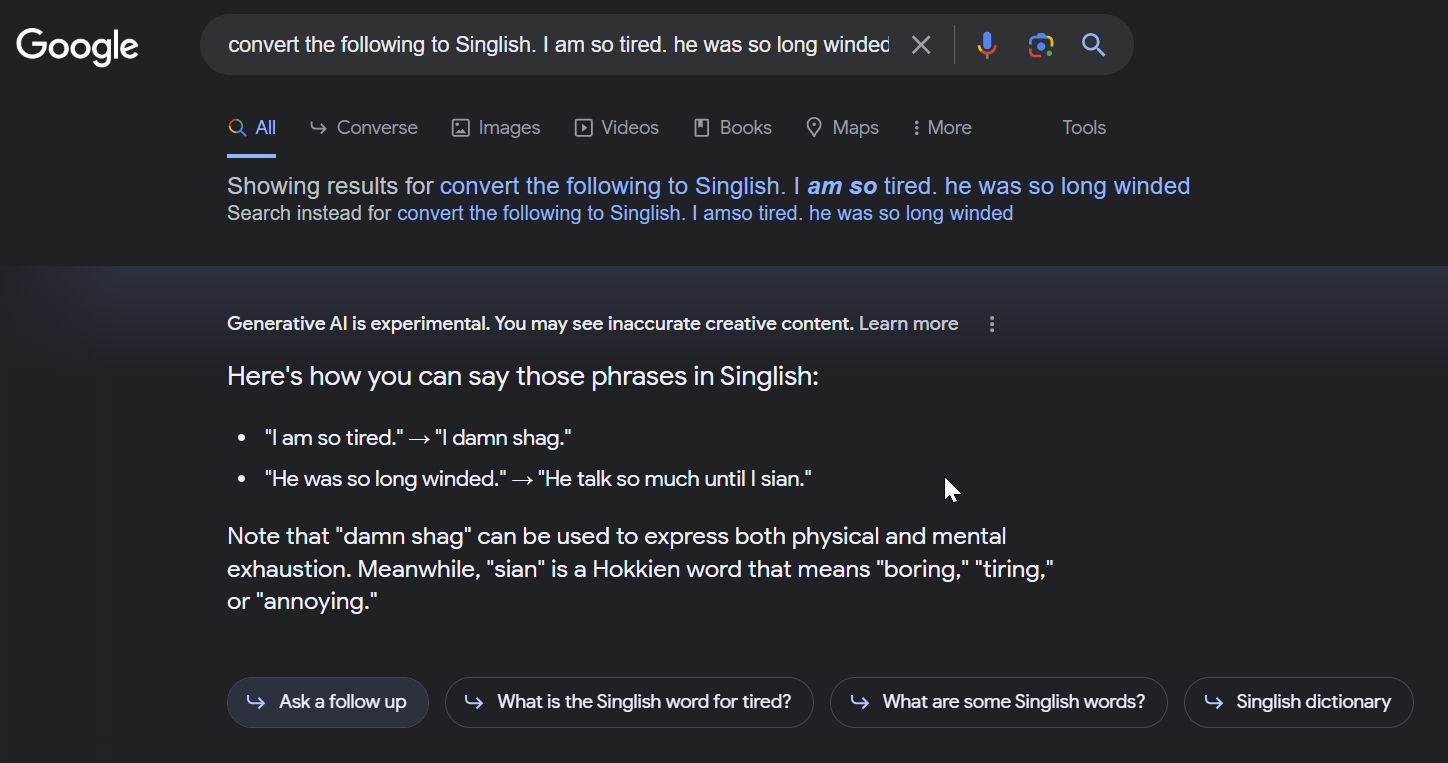 Interestingly, while it typically cannot converse causally with you, this does not mean Google SGE cannot follow instructions and do various tasks. For example, when I ask it to convert a certain phrase into Singlish and convert a string of characters all into upper case, it does so readily.
