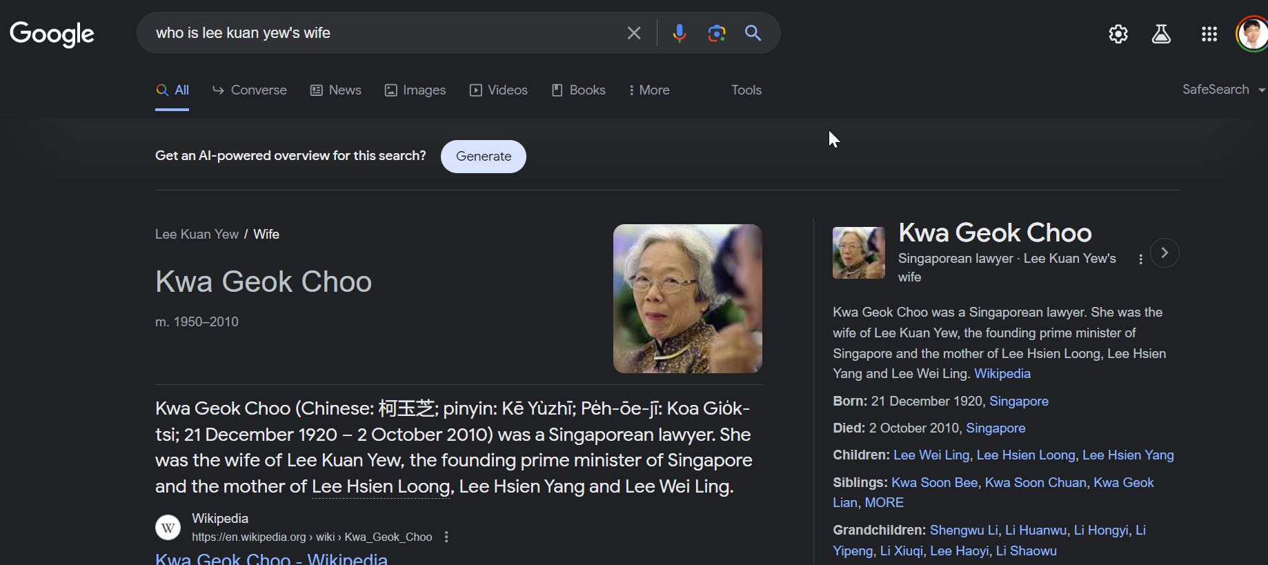 In the example below, the query was where was Lee Kuan Yew born?