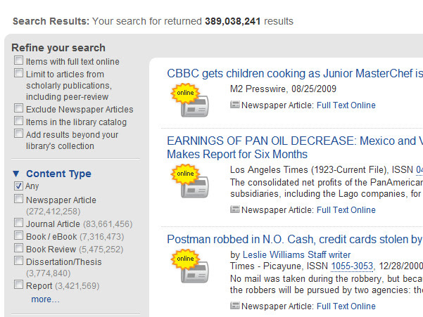 For example in the blank search above, you can see the library has 389 million items, of which 272 million items are in Newspaper Article and 83 million are journal articles etc.