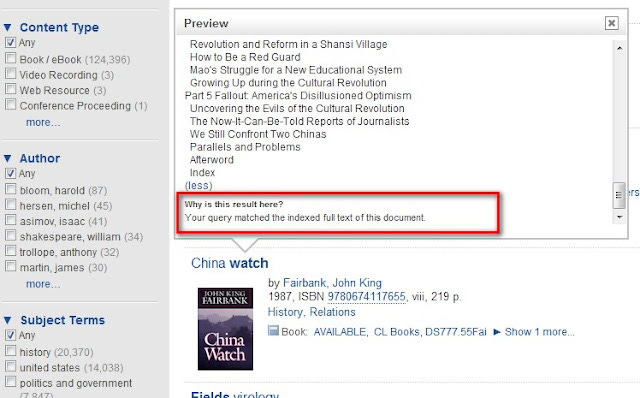 Another issue specific to Summon is while it tells you that a result is obtained due to a match in the full-text, you can't quite verify it easily since unlike Google books it doesn't have a "snipplet view" to see the words in context.