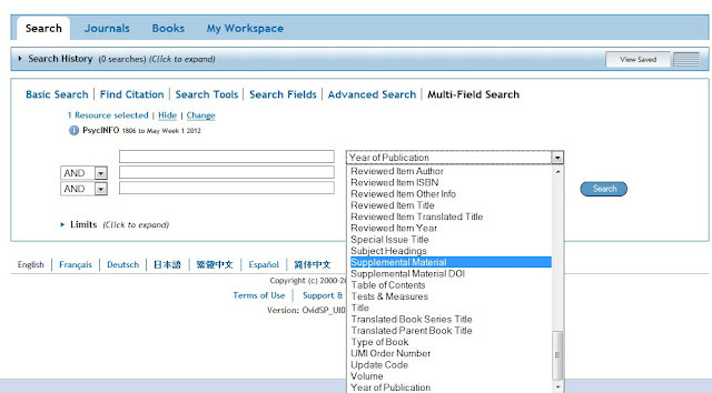 With library databases on the other we have tons of field searches. In business source premier on Ebscohost I see 19 fields you can search, with Psychinfo on ovidSp I count over 70 fields searchable! With so many fields available to search, it is pretty common for many databases to offer multiple search fields connected with boolean operators pull down menus like the multi-field search in OVIDSP below.