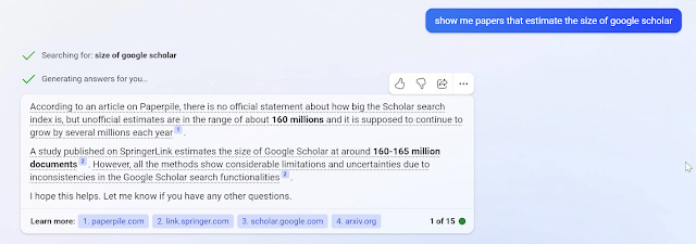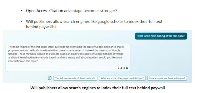 Just as Google is faced with a business model issue as the nature of this new search engines means, answers can be displayed automatically in the search without users needing to go on to the webpages, Google Scholar and Publishers like Elsevier will face a tricky decision.