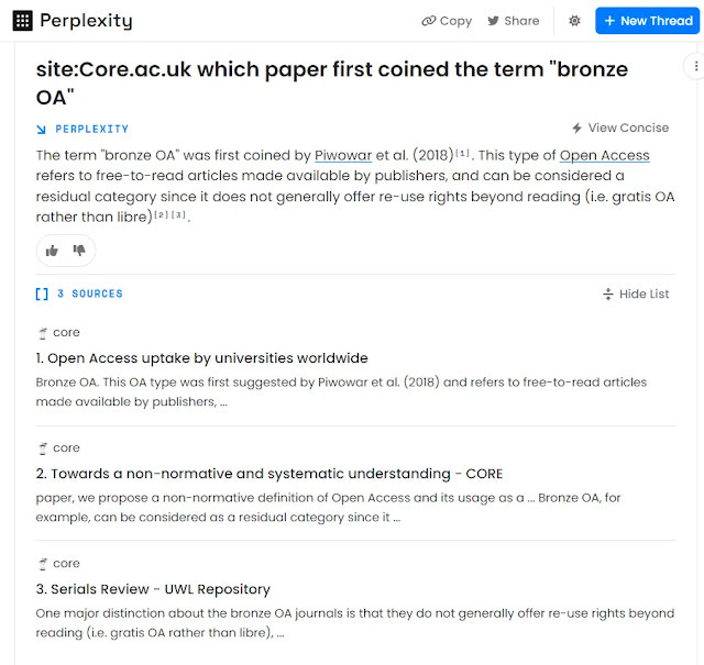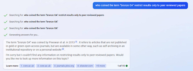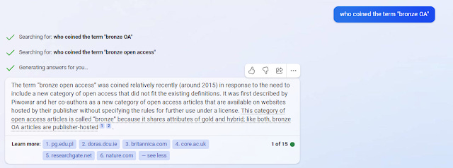 If you ask the new Bing, who coined the term bronze OA, it is able to come up with the answer, but the source it obtained the result from is not an academic paper.