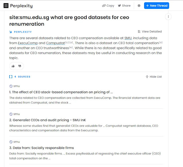 Trying the same query in Perplexity but limiting it to results from smu.edu.sg, gets even better and more specific answers, because it can "see" into the Open Access PDF, available on our institutional repository and from there it can figure out the right datasets/databases typically used by our researchers! More on that later.