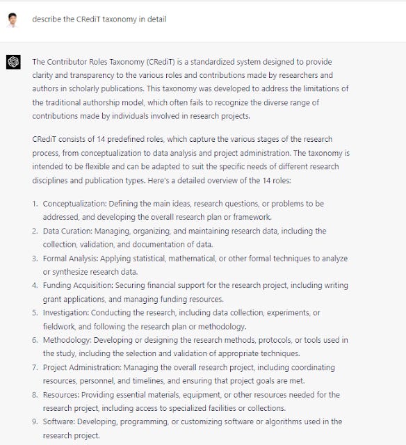 I was recently writing an article for work on the CRediT taxonomy and it took me around 30 minutes to write it all out. I later realized I could have just use ChatGPT or even better the new Bing and it would generate perfectly serviceable writings.