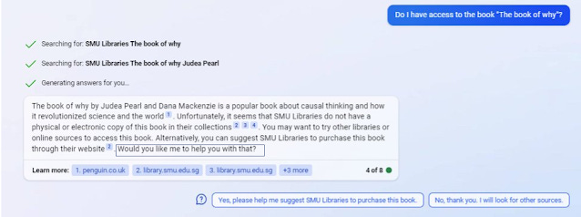 In the example below, it did not realize my University did have access to the book "The book of why". Even so, I was impressed by how it didn't stop there, but pointed out you could "Suggest SMU Libraries to purchase through their website" and if you asked it do so, it would point you to the form.