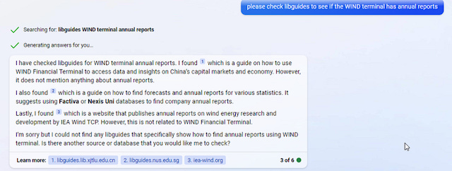While the answers are not specific to my institution resources, I am very amazed at how human-like the responses are, probing questions like "What kind of analysis are you planning to do with these dataset", "What Industry or time period are you interested in", are the sorts of things up to now only real human librarians would ask!