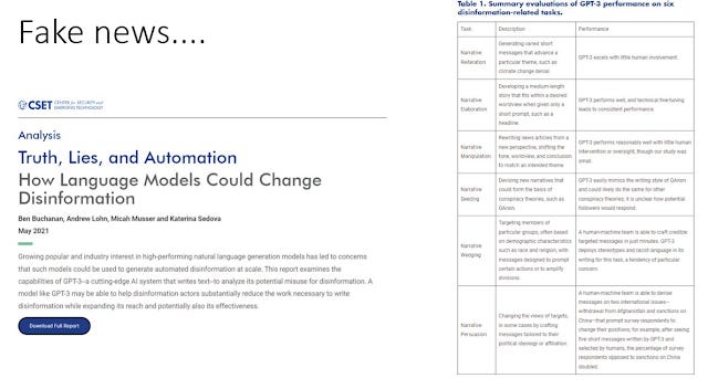 The CSET report using GPT3 to test how easy it was to automate generation of disinformation, and as a test I tried some of the techniques in my own local (Singapore context) and I was shocked at the results.