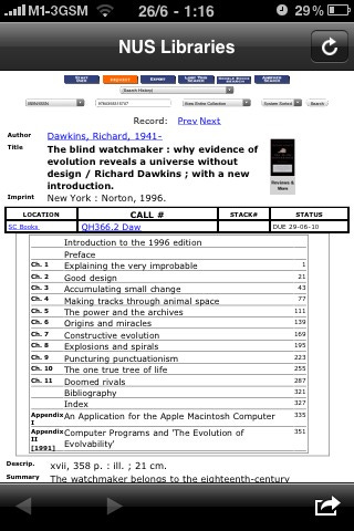 Early this year, I blogged about using Zbar iPhone app as a barcode reader to search your library. You scan the barcode of a book with your phone and it would extract the ISBN and search the library catalogue. You could put a setting in the iphone app and it would work for almost any library catalogue.