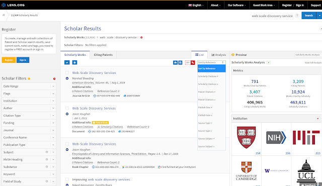 I first read about Lens.org via a tweet on my way back from a conference in April 2018. There seemed to be something in the water at the time, as they was an explosion of new discovery services and idexes in the past few months, including Digital science's Dimensions, 1Science's 1Findr, Scilit and the new resurgent challenge to Google Scholar posed by Microsoft Academic.