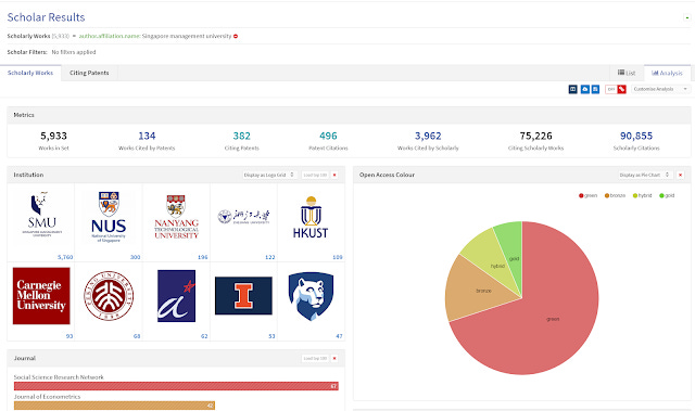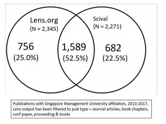 I will cover in greater depth a couple of tests I did in my next blog post, but here are some preliminary results I got in a test I did by comparing items in Lens with author affiliation - "Singapore Management University" against the output I obtained from Scival.