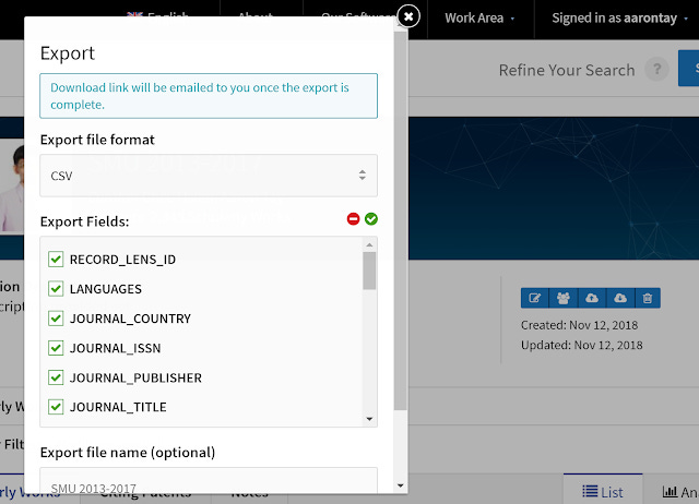 It is somewhat disappointing though that while you can export a bunch of fields , unlike Scopus or Web of Science you can't export the references, which can be useful for bibliometric analysis using tools like VOSviewer.