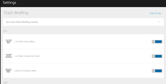 There are also some info desk skills and skills relating to libraries . A common one would be something like the Library of Congress News skill which adds news to your flash briefing. Fairfax County Library LA public library and even a journal The American Society of Human Genetics have the same type of skill. Flash briefings are content from providers you have chosen to add and you can say "Listen to my Flash briefings" to hear them.